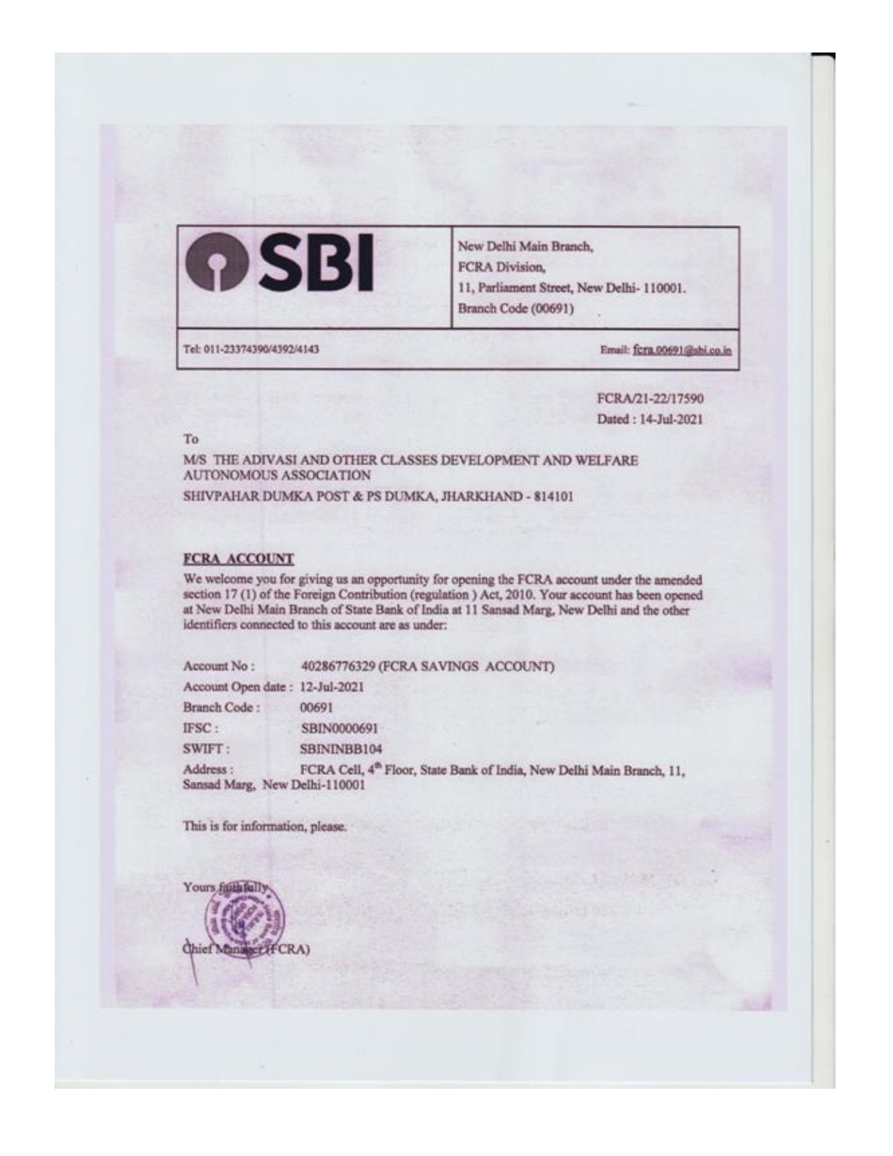 FCRA Account New in Delhi Main Branch